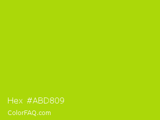 Hex #abd809 Color is a normal lime color and the nearest color is Vivid Lime Green #a6d608. Hex code #abd809 and RGB value is rgb(171,216,9). In RGB color space, this color is composed of 67% red, 85% green, 4% blue, In CMYK color space, this color is composed of 21% cyan, 0% magenta, 96% yellow , 15% black , In HSL color space, this color has a hue angle of 73° , 92% saturation and 44% lightness.