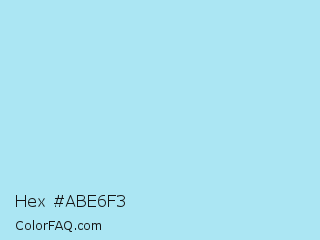 Hex #abe6f3 Color is a very light cyan color and the nearest color is Blizzard Blue #ace5ee. Hex code #abe6f3 and RGB value is rgb(171,230,243). In RGB color space, this color is composed of 67% red, 90% green, 95% blue, In CMYK color space, this color is composed of 30% cyan, 5% magenta, 0% yellow , 5% black , In HSL color space, this color has a hue angle of 191° , 75% saturation and 81% lightness.