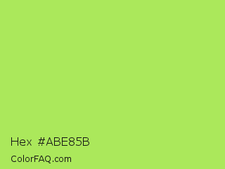 Hex #abe85b Color is a light green color and the nearest color is Inchworm #b2ec5d. Hex code #abe85b and RGB value is rgb(171,232,91). In RGB color space, this color is composed of 67% red, 91% green, 36% blue, In CMYK color space, this color is composed of 26% cyan, 0% magenta, 61% yellow , 9% black , In HSL color space, this color has a hue angle of 86° , 75% saturation and 63% lightness.