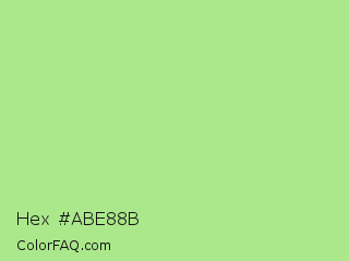Hex #abe88b Color is a light green color and the nearest color is Feijoa #9fdd8c. Hex code #abe88b and RGB value is rgb(171,232,139). In RGB color space, this color is composed of 67% red, 91% green, 55% blue, In CMYK color space, this color is composed of 26% cyan, 0% magenta, 40% yellow , 9% black , In HSL color space, this color has a hue angle of 99° , 67% saturation and 73% lightness.