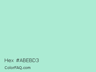 Hex #abebd3 Color is a light green color and the nearest color is Magic Mint #aaf0d1. Hex code #abebd3 and RGB value is rgb(171,235,211). In RGB color space, this color is composed of 67% red, 92% green, 83% blue, In CMYK color space, this color is composed of 27% cyan, 0% magenta, 10% yellow , 8% black , In HSL color space, this color has a hue angle of 158° , 62% saturation and 80% lightness.