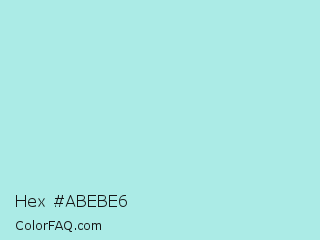 Hex #abebe6 Color is a light cyan color and the nearest color is Pale Turquoise #afeeee. Hex code #abebe6 and RGB value is rgb(171,235,230). In RGB color space, this color is composed of 67% red, 92% green, 90% blue, In CMYK color space, this color is composed of 27% cyan, 0% magenta, 2% yellow , 8% black , In HSL color space, this color has a hue angle of 175° , 62% saturation and 80% lightness.