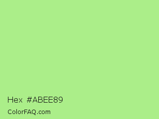 Hex #abee89 Color is a light green color and the nearest color is Feijoa #9fdd8c. Hex code #abee89 and RGB value is rgb(171,238,137). In RGB color space, this color is composed of 67% red, 93% green, 54% blue, In CMYK color space, this color is composed of 28% cyan, 0% magenta, 42% yellow , 7% black , In HSL color space, this color has a hue angle of 100° , 75% saturation and 74% lightness.