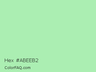 Hex #abeeb2 Color is a light green color and the nearest color is Celadon #ace1af. Hex code #abeeb2 and RGB value is rgb(171,238,178). In RGB color space, this color is composed of 67% red, 93% green, 70% blue, In CMYK color space, this color is composed of 28% cyan, 0% magenta, 25% yellow , 7% black , In HSL color space, this color has a hue angle of 126° , 66% saturation and 80% lightness.