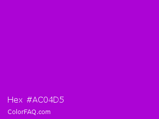 Hex #ac04d5 Color is a normal purple color and the nearest color is Vivid Mulberry #b80ce3. Hex code #ac04d5 and RGB value is rgb(172,4,213). In RGB color space, this color is composed of 67% red, 2% green, 84% blue, In CMYK color space, this color is composed of 19% cyan, 98% magenta, 0% yellow , 16% black , In HSL color space, this color has a hue angle of 288° , 96% saturation and 43% lightness.