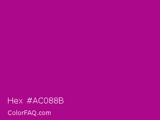 Hex #ac088b Color is a normal magenta color and the nearest color is Violet Eggplant #991199. Hex code #ac088b and RGB value is rgb(172,8,139). In RGB color space, this color is composed of 67% red, 3% green, 55% blue, In CMYK color space, this color is composed of 0% cyan, 95% magenta, 19% yellow , 33% black , In HSL color space, this color has a hue angle of 312° , 91% saturation and 35% lightness.