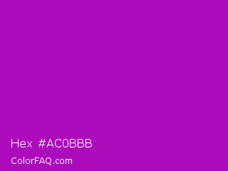 Hex #ac0bbb Color is a normal magenta color and the nearest color is Heliotrope Magenta #aa00bb. Hex code #ac0bbb and RGB value is rgb(172,11,187). In RGB color space, this color is composed of 67% red, 4% green, 73% blue, In CMYK color space, this color is composed of 8% cyan, 94% magenta, 0% yellow , 27% black , In HSL color space, this color has a hue angle of 295° , 89% saturation and 39% lightness.