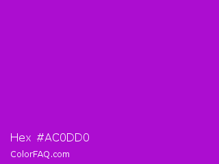 Hex #ac0dd0 Color is a normal purple color and the nearest color is Purple Munsell #9f00c5. Hex code #ac0dd0 and RGB value is rgb(172,13,208). In RGB color space, this color is composed of 67% red, 5% green, 82% blue, In CMYK color space, this color is composed of 17% cyan, 94% magenta, 0% yellow , 18% black , In HSL color space, this color has a hue angle of 289° , 88% saturation and 43% lightness.