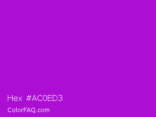 Hex #ac0ed3 Color is a normal purple color and the nearest color is Vivid Mulberry #b80ce3. Hex code #ac0ed3 and RGB value is rgb(172,14,211). In RGB color space, this color is composed of 67% red, 5% green, 83% blue, In CMYK color space, this color is composed of 18% cyan, 93% magenta, 0% yellow , 17% black , In HSL color space, this color has a hue angle of 288° , 88% saturation and 44% lightness.