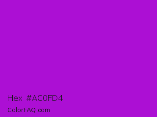 Hex #ac0fd4 Color is a normal purple color and the nearest color is Vivid Mulberry #b80ce3. Hex code #ac0fd4 and RGB value is rgb(172,15,212). In RGB color space, this color is composed of 67% red, 6% green, 83% blue, In CMYK color space, this color is composed of 19% cyan, 93% magenta, 0% yellow , 17% black , In HSL color space, this color has a hue angle of 288° , 87% saturation and 45% lightness.