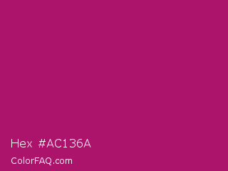 Hex #ac136a Color is a normal magenta color and the nearest color is Lipstick #ab0563. Hex code #ac136a and RGB value is rgb(172,19,106). In RGB color space, this color is composed of 67% red, 7% green, 42% blue, In CMYK color space, this color is composed of 0% cyan, 89% magenta, 38% yellow , 33% black , In HSL color space, this color has a hue angle of 326° , 80% saturation and 37% lightness.