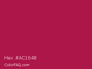 Hex #ac1648 Color is a normal rose color and the nearest color is French Wine #ac1e44. Hex code #ac1648 and RGB value is rgb(172,22,72). In RGB color space, this color is composed of 67% red, 9% green, 28% blue, In CMYK color space, this color is composed of 0% cyan, 87% magenta, 58% yellow , 33% black , In HSL color space, this color has a hue angle of 340° , 77% saturation and 38% lightness.
