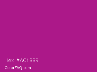 Hex #ac1889 Color is a normal magenta color and the nearest color is Violet Eggplant #991199. Hex code #ac1889 and RGB value is rgb(172,24,137). In RGB color space, this color is composed of 67% red, 9% green, 54% blue, In CMYK color space, this color is composed of 0% cyan, 86% magenta, 20% yellow , 33% black , In HSL color space, this color has a hue angle of 314° , 76% saturation and 38% lightness.