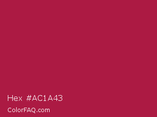 Hex #ac1a43 Color is a normal rose color and the nearest color is French Wine #ac1e44. Hex code #ac1a43 and RGB value is rgb(172,26,67). In RGB color space, this color is composed of 67% red, 10% green, 26% blue, In CMYK color space, this color is composed of 0% cyan, 85% magenta, 61% yellow , 33% black , In HSL color space, this color has a hue angle of 343° , 74% saturation and 39% lightness.