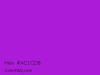 Hex #ac1cd8 Color is a normal purple color and the nearest color is Vivid Mulberry #b80ce3. Hex code #ac1cd8 and RGB value is rgb(172,28,216). In RGB color space, this color is composed of 67% red, 11% green, 85% blue, In CMYK color space, this color is composed of 20% cyan, 87% magenta, 0% yellow , 15% black , In HSL color space, this color has a hue angle of 286° , 77% saturation and 48% lightness.