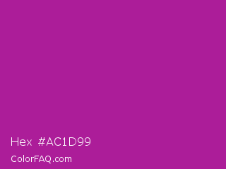 Hex #ac1d99 Color is a normal magenta color and the nearest color is Violet Eggplant #991199. Hex code #ac1d99 and RGB value is rgb(172,29,153). In RGB color space, this color is composed of 67% red, 11% green, 60% blue, In CMYK color space, this color is composed of 0% cyan, 83% magenta, 11% yellow , 33% black , In HSL color space, this color has a hue angle of 308° , 71% saturation and 39% lightness.