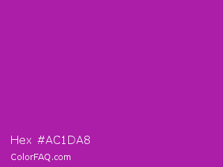 Hex #ac1da8 Color is a normal magenta color and the nearest color is Violet Eggplant #991199. Hex code #ac1da8 and RGB value is rgb(172,29,168). In RGB color space, this color is composed of 67% red, 11% green, 66% blue, In CMYK color space, this color is composed of 0% cyan, 83% magenta, 2% yellow , 33% black , In HSL color space, this color has a hue angle of 302° , 71% saturation and 39% lightness.