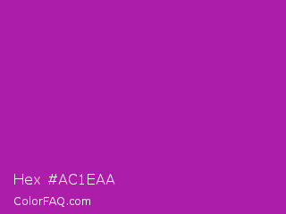 Hex #ac1eaa Color is a normal magenta color and the nearest color is Byzantine #bd33a4. Hex code #ac1eaa and RGB value is rgb(172,30,170). In RGB color space, this color is composed of 67% red, 12% green, 67% blue, In CMYK color space, this color is composed of 0% cyan, 83% magenta, 1% yellow , 33% black , In HSL color space, this color has a hue angle of 301° , 70% saturation and 40% lightness.