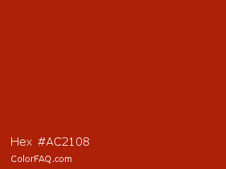 Hex #ac2108 Color is a normal red color and the nearest color is Rufous #a81c07. Hex code #ac2108 and RGB value is rgb(172,33,8). In RGB color space, this color is composed of 67% red, 13% green, 3% blue, In CMYK color space, this color is composed of 0% cyan, 81% magenta, 95% yellow , 33% black , In HSL color space, this color has a hue angle of 9° , 91% saturation and 35% lightness.