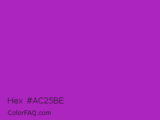 Hex #ac25be Color is a normal magenta color and the nearest color is Dark Orchid #9932cc. Hex code #ac25be and RGB value is rgb(172,37,190). In RGB color space, this color is composed of 67% red, 15% green, 75% blue, In CMYK color space, this color is composed of 9% cyan, 81% magenta, 0% yellow , 25% black , In HSL color space, this color has a hue angle of 293° , 67% saturation and 45% lightness.