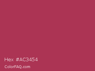 Hex #ac3454 Color is a normal rose color and the nearest color is Night Shadz #aa375a. Hex code #ac3454 and RGB value is rgb(172,52,84). In RGB color space, this color is composed of 67% red, 20% green, 33% blue, In CMYK color space, this color is composed of 0% cyan, 70% magenta, 51% yellow , 33% black , In HSL color space, this color has a hue angle of 344° , 54% saturation and 44% lightness.