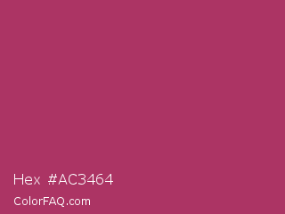Hex #ac3464 Color is a normal rose color and the nearest color is Rich Maroon #b03060. Hex code #ac3464 and RGB value is rgb(172,52,100). In RGB color space, this color is composed of 67% red, 20% green, 39% blue, In CMYK color space, this color is composed of 0% cyan, 70% magenta, 42% yellow , 33% black , In HSL color space, this color has a hue angle of 336° , 54% saturation and 44% lightness.