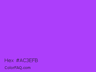 Hex #ac3efb Color is a light purple color and the nearest color is Veronica #a020f0. Hex code #ac3efb and RGB value is rgb(172,62,251). In RGB color space, this color is composed of 67% red, 24% green, 98% blue, In CMYK color space, this color is composed of 31% cyan, 75% magenta, 0% yellow , 2% black , In HSL color space, this color has a hue angle of 275° , 96% saturation and 61% lightness.