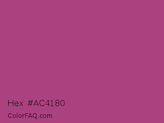 Hex #ac4180 Color is a normal magenta color and the nearest color is Mystic Maroon #ad4379. Hex code #ac4180 and RGB value is rgb(172,65,128). In RGB color space, this color is composed of 67% red, 25% green, 50% blue, In CMYK color space, this color is composed of 0% cyan, 62% magenta, 26% yellow , 33% black , In HSL color space, this color has a hue angle of 325° , 45% saturation and 46% lightness.