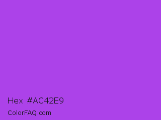 Hex #ac42e9 Color is a normal purple color and the nearest color is Navy Purple #9457eb. Hex code #ac42e9 and RGB value is rgb(172,66,233). In RGB color space, this color is composed of 67% red, 26% green, 91% blue, In CMYK color space, this color is composed of 26% cyan, 72% magenta, 0% yellow , 9% black , In HSL color space, this color has a hue angle of 278° , 79% saturation and 59% lightness.