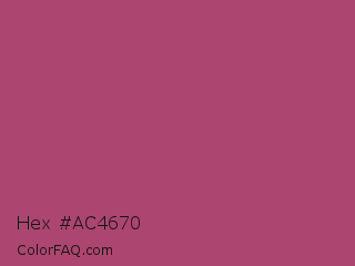 Hex #ac4670 Color is a normal rose color and the nearest color is Raspberry Rose #b3446c. Hex code #ac4670 and RGB value is rgb(172,70,112). In RGB color space, this color is composed of 67% red, 27% green, 44% blue, In CMYK color space, this color is composed of 0% cyan, 59% magenta, 35% yellow , 33% black , In HSL color space, this color has a hue angle of 335° , 42% saturation and 47% lightness.