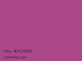 Hex #ac4889 Color is a normal magenta color and the nearest color is Mystic Maroon #ad4379. Hex code #ac4889 and RGB value is rgb(172,72,137). In RGB color space, this color is composed of 67% red, 28% green, 54% blue, In CMYK color space, this color is composed of 0% cyan, 58% magenta, 20% yellow , 33% black , In HSL color space, this color has a hue angle of 321° , 41% saturation and 48% lightness.