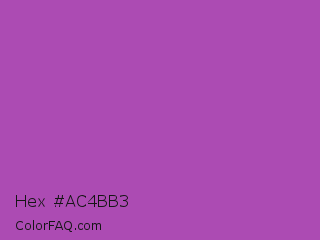 Hex #ac4bb3 Color is a normal magenta color and the nearest color is Purple Plum #9c51b6. Hex code #ac4bb3 and RGB value is rgb(172,75,179). In RGB color space, this color is composed of 67% red, 29% green, 70% blue, In CMYK color space, this color is composed of 4% cyan, 58% magenta, 0% yellow , 30% black , In HSL color space, this color has a hue angle of 296° , 41% saturation and 50% lightness.