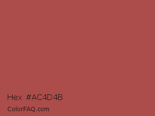 Hex #ac4d4b Color is a normal red color and the nearest color is Rose Vale #ab4e52. Hex code #ac4d4b and RGB value is rgb(172,77,75). In RGB color space, this color is composed of 67% red, 30% green, 29% blue, In CMYK color space, this color is composed of 0% cyan, 55% magenta, 56% yellow , 33% black , In HSL color space, this color has a hue angle of 1° , 39% saturation and 48% lightness.