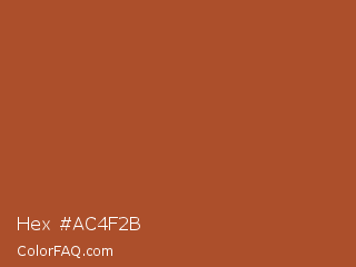 Hex #ac4f2b Color is a normal orange color and the nearest color is Paarl #a65529. Hex code #ac4f2b and RGB value is rgb(172,79,43). In RGB color space, this color is composed of 67% red, 31% green, 17% blue, In CMYK color space, this color is composed of 0% cyan, 54% magenta, 75% yellow , 33% black , In HSL color space, this color has a hue angle of 17° , 60% saturation and 42% lightness.