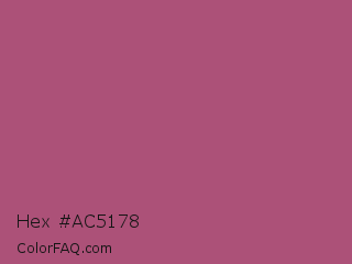 Hex #ac5178 Color is a normal rose color and the nearest color is China Rose #a8516e. Hex code #ac5178 and RGB value is rgb(172,81,120). In RGB color space, this color is composed of 67% red, 32% green, 47% blue, In CMYK color space, this color is composed of 0% cyan, 53% magenta, 30% yellow , 33% black , In HSL color space, this color has a hue angle of 334° , 36% saturation and 50% lightness.