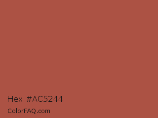 Hex #ac5244 Color is a normal red color and the nearest color is Apple Blossom #af4d43. Hex code #ac5244 and RGB value is rgb(172,82,68). In RGB color space, this color is composed of 67% red, 32% green, 27% blue, In CMYK color space, this color is composed of 0% cyan, 52% magenta, 60% yellow , 33% black , In HSL color space, this color has a hue angle of 8° , 43% saturation and 47% lightness.