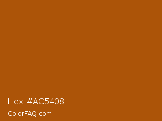 Hex #ac5408 Color is a normal orange color and the nearest color is Rich Gold #a85307. Hex code #ac5408 and RGB value is rgb(172,84,8). In RGB color space, this color is composed of 67% red, 33% green, 3% blue, In CMYK color space, this color is composed of 0% cyan, 51% magenta, 95% yellow , 33% black , In HSL color space, this color has a hue angle of 28° , 91% saturation and 35% lightness.