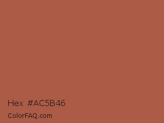 Hex #ac5b46 Color is a normal red color and the nearest color is Brown Rust #af593e. Hex code #ac5b46 and RGB value is rgb(172,91,70). In RGB color space, this color is composed of 67% red, 36% green, 27% blue, In CMYK color space, this color is composed of 0% cyan, 47% magenta, 59% yellow , 33% black , In HSL color space, this color has a hue angle of 12° , 42% saturation and 47% lightness.