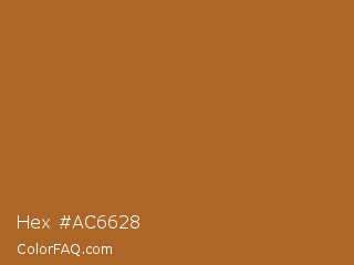Hex #ac6628 Color is a normal orange color and the nearest color is Desert #ae6020. Hex code #ac6628 and RGB value is rgb(172,102,40). In RGB color space, this color is composed of 67% red, 40% green, 16% blue, In CMYK color space, this color is composed of 0% cyan, 41% magenta, 77% yellow , 33% black , In HSL color space, this color has a hue angle of 28° , 62% saturation and 42% lightness.