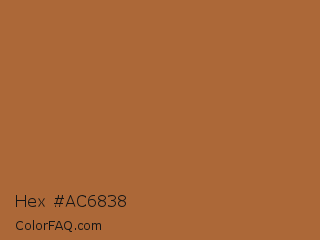 Hex #ac6838 Color is a normal orange color and the nearest color is Brown Rust #af593e. Hex code #ac6838 and RGB value is rgb(172,104,56). In RGB color space, this color is composed of 67% red, 41% green, 22% blue, In CMYK color space, this color is composed of 0% cyan, 40% magenta, 67% yellow , 33% black , In HSL color space, this color has a hue angle of 25° , 51% saturation and 45% lightness.