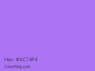 Hex #ac74f4 Color is a light violet color and the nearest color is Lavender #b57edc. Hex code #ac74f4 and RGB value is rgb(172,116,244). In RGB color space, this color is composed of 67% red, 45% green, 96% blue, In CMYK color space, this color is composed of 30% cyan, 52% magenta, 0% yellow , 4% black , In HSL color space, this color has a hue angle of 266° , 85% saturation and 71% lightness.