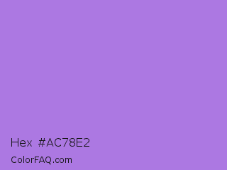 Hex #ac78e2 Color is a light violet color and the nearest color is Lavender #b57edc. Hex code #ac78e2 and RGB value is rgb(172,120,226). In RGB color space, this color is composed of 67% red, 47% green, 89% blue, In CMYK color space, this color is composed of 24% cyan, 47% magenta, 0% yellow , 11% black , In HSL color space, this color has a hue angle of 269° , 65% saturation and 68% lightness.