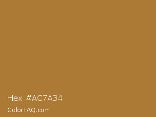 Hex #ac7a34 Color is a normal orange color and the nearest color is Copper #b87333. Hex code #ac7a34 and RGB value is rgb(172,122,52). In RGB color space, this color is composed of 67% red, 48% green, 20% blue, In CMYK color space, this color is composed of 0% cyan, 29% magenta, 70% yellow , 33% black , In HSL color space, this color has a hue angle of 35° , 54% saturation and 44% lightness.