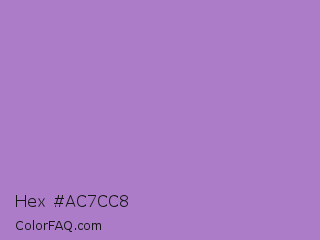 Hex #ac7cc8 Color is a light purple color and the nearest color is African Violet #b284be. Hex code #ac7cc8 and RGB value is rgb(172,124,200). In RGB color space, this color is composed of 67% red, 49% green, 78% blue, In CMYK color space, this color is composed of 14% cyan, 38% magenta, 0% yellow , 22% black , In HSL color space, this color has a hue angle of 278° , 41% saturation and 64% lightness.
