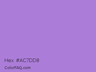 Hex #ac7dd8 Color is a light purple color and the nearest color is Lavender #b57edc. Hex code #ac7dd8 and RGB value is rgb(172,125,216). In RGB color space, this color is composed of 67% red, 49% green, 85% blue, In CMYK color space, this color is composed of 20% cyan, 42% magenta, 0% yellow , 15% black , In HSL color space, this color has a hue angle of 271° , 54% saturation and 67% lightness.