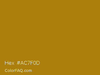 Hex #ac7f0d Color is a normal orange color and the nearest color is Hot Toddy #b38007. Hex code #ac7f0d and RGB value is rgb(172,127,13). In RGB color space, this color is composed of 67% red, 50% green, 5% blue, In CMYK color space, this color is composed of 0% cyan, 26% magenta, 92% yellow , 33% black , In HSL color space, this color has a hue angle of 43° , 86% saturation and 36% lightness.