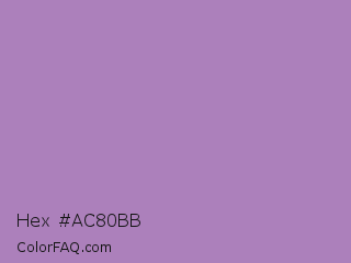 Hex #ac80bb Color is a light purple color and the nearest color is African Violet #b284be. Hex code #ac80bb and RGB value is rgb(172,128,187). In RGB color space, this color is composed of 67% red, 50% green, 73% blue, In CMYK color space, this color is composed of 8% cyan, 32% magenta, 0% yellow , 27% black , In HSL color space, this color has a hue angle of 285° , 30% saturation and 62% lightness.