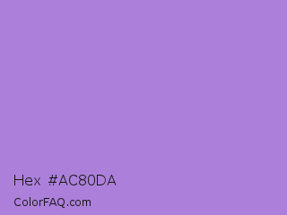 Hex #ac80da Color is a light violet color and the nearest color is Lavender #b57edc. Hex code #ac80da and RGB value is rgb(172,128,218). In RGB color space, this color is composed of 67% red, 50% green, 85% blue, In CMYK color space, this color is composed of 21% cyan, 41% magenta, 0% yellow , 15% black , In HSL color space, this color has a hue angle of 269° , 55% saturation and 68% lightness.