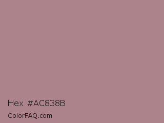 Hex #ac838b Color is a normal red color and the nearest color is English Lavender #b48395. Hex code #ac838b and RGB value is rgb(172,131,139). In RGB color space, this color is composed of 67% red, 51% green, 55% blue, In CMYK color space, this color is composed of 0% cyan, 24% magenta, 19% yellow , 33% black , In HSL color space, this color has a hue angle of 348° , 20% saturation and 59% lightness.