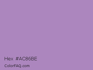 Hex #ac86be Color is a light purple color and the nearest color is African Violet #b284be. Hex code #ac86be and RGB value is rgb(172,134,190). In RGB color space, this color is composed of 67% red, 53% green, 75% blue, In CMYK color space, this color is composed of 9% cyan, 29% magenta, 0% yellow , 25% black , In HSL color space, this color has a hue angle of 281° , 30% saturation and 64% lightness.